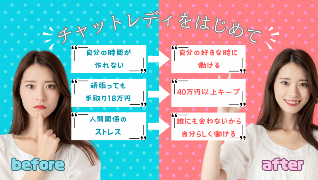 チャットレディとは、パソコンとウェブカメラを使って、お相手とは直接会わずに画面越しでお話したり、パフォーマンスで楽しませるお仕事です。 完全個室のチャットルームにはコスプレ衣装も用意されていて、まるで別のキャラクターになりきることもできます。また、身元を明かさずに働けるので、顔を出さずにお仕事することも可能です。知り合いにバレる心配もないので、安心して働けます♪
